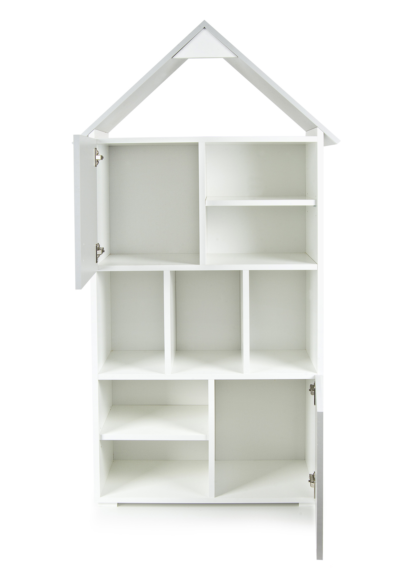 Simple modern white and grey bookshelf with a shape of a house. Made of high quality materials. Perfect for kids' bedroms and nurseries, will also be suitable for an office or study or even a bathroom. Spacious storage with 10 compartments can store books, photos, DVDs, toys, home decor and a lot more. Will help in keeping the room clean, all the mess disappears behind the doors. Can be easily turned into a dollhouse, providing hours of fun. Made of high quality furniture board. The bookshelf can be placed at the wall using the hook at the back. Dimensions: Width: 80 cm Depth: 32 cm Height: 161 cm Shelf depth: 29,5 cm Weight: 37 kg Delivered in two separate packages. Package dimensions: 1 package: 134 x 37 x 11 cm / weight: 22,5 kg 2 package: 78 x 51 x 10 cm / weight: 14,5 kg