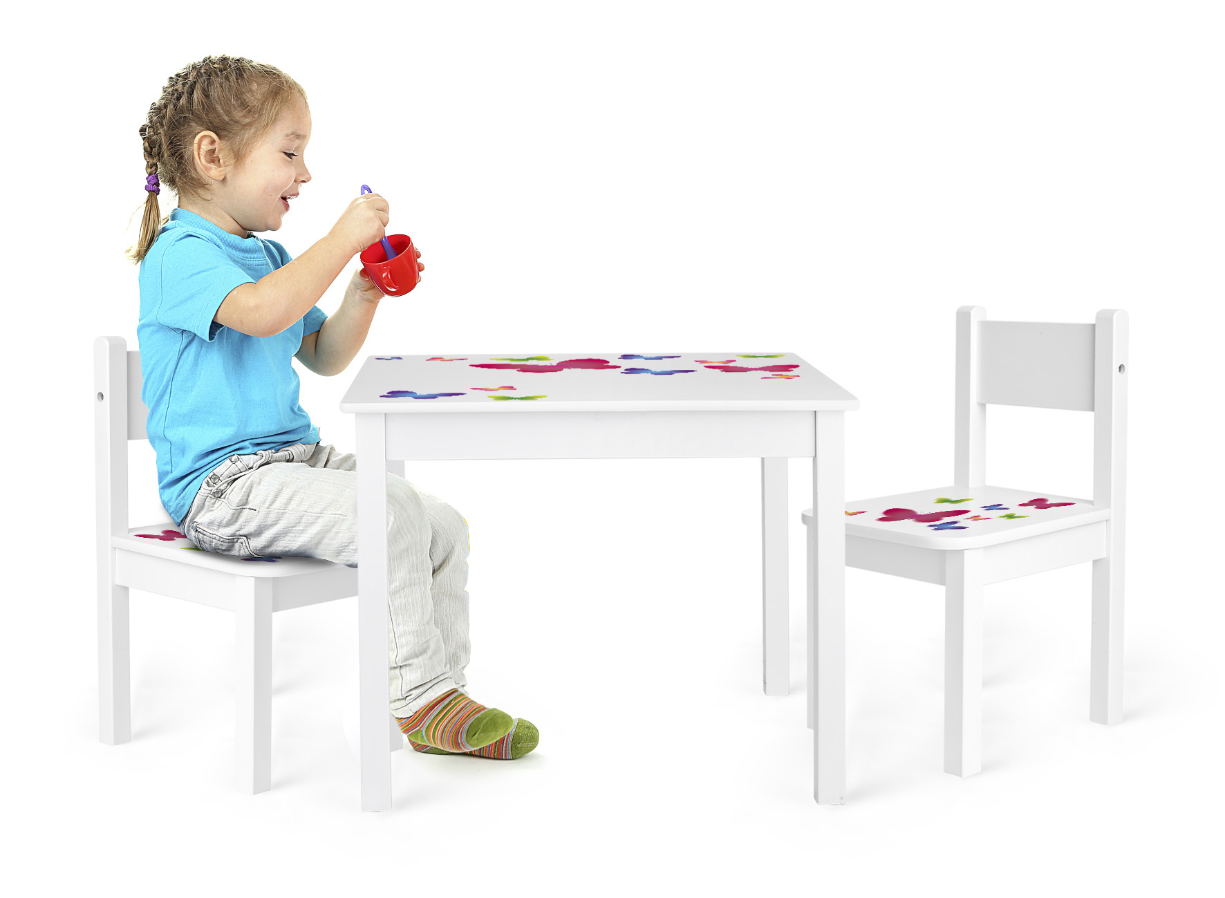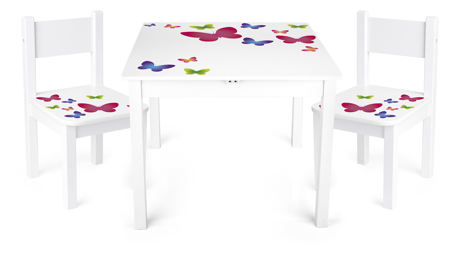 A table and two chairs set made exclusively of wood, with a butterflies pattern UV print. The set will fit perfectly every children bedroom; it can also be used as a small drawing table e.g. in the nursery or kindergarten. Suitable for children aged 2+. Table dimensions: 60 x 60 x 49 cm. Chair dimension: 26 x 29 x 48 cm. Seat height: 25 cm. Package dimensions: 66 x 9 x 66 cm.