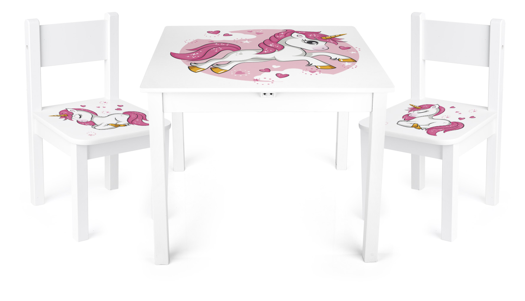 A table and two chairs set made exclusively of wood, with a unicorn pattern UV print. The set will fit perfectly every children bedroom; it can also be used as a small drawing table e.g. in the nursery or kindergarten. Suitable for children aged 2+. Table dimensions: 60 x 60 x 49 cm. Chair dimension: 26 x 29 x 48 cm. Seat height: 25 cm. Package dimensions: 66 x 9 x 66 cm.